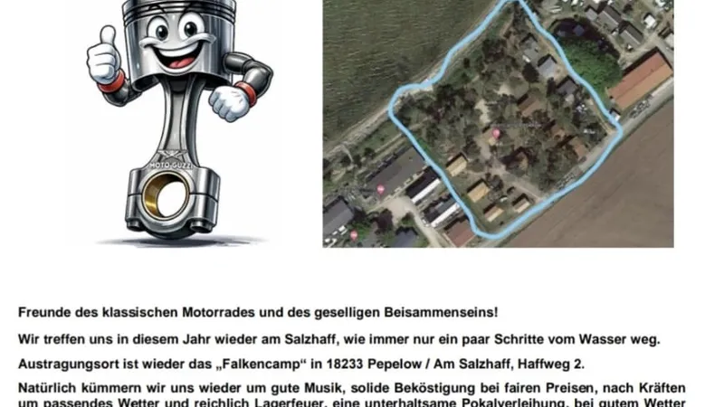 The beating heart of the rally will once again be Falkencamp, located just a few steps from the sparkling waters of the Salzhaff. This enchanting location offers the ideal setting for a weekend of relaxation and fun. The organizers have thought of everything to ensure a memorable experience: expect good music to accompany the evenings, solid catering at fair prices to recharge your energy, and, of course, the inevitable campfire that will create the perfect atmosphere for stories and laughter under the stars. There will also be an entertaining trophy ceremony to add a touch of friendly competition.