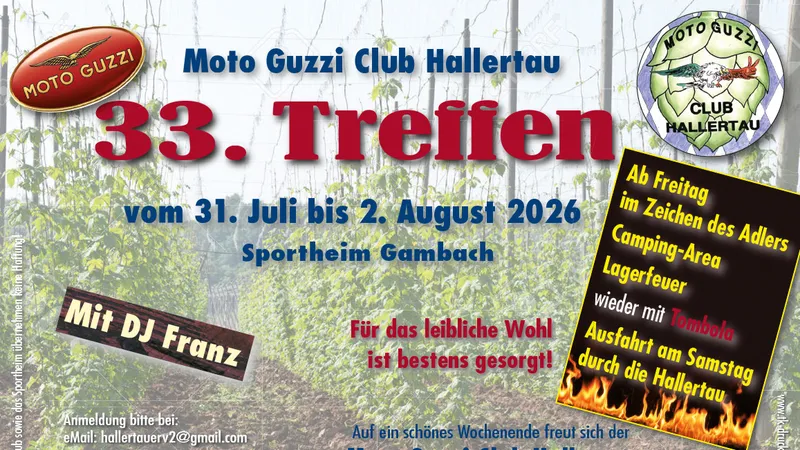 The Moto Guzzi Club Hallertau is delighted to invite you to its 33rd Treffen, an unmissable event taking place from July 31 to August 2, 2026, at the Sportheim Gambach in Rohrbach, Germany. Get ready for a weekend dedicated to pure Moto Guzzi passion, immersed in the beautiful setting of Hallertau, the world's largest hop-growing region. It will be a perfect opportunity to meet up with friends, share stories and miles, and collectively celebrate the unique spirit that binds all Guzzisti.