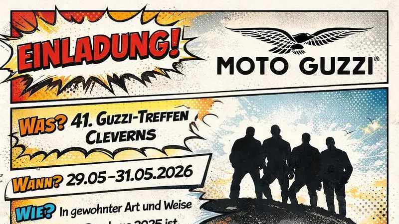 Dear Guzzisti, get ready to mark your calendars for May 29-31, 2026! The legendary 41st Guzzi-Treffen Cleverns awaits you in Germany for an unforgettable weekend dedicated to Moto Guzzi passion. This annual rally is an unmissable event for lovers of the Mandello eagles, a perfect opportunity to meet up, share travel stories, and collectively celebrate the unique spirit that binds us all. Whether you are a veteran of countless Treffen or about to experience your first, Cleverns will welcome you with open arms for an event that promises fun, good company, and the unmistakable roar of our engines.